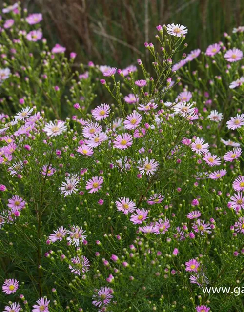 Die Garten-Myrten-Aster 'Esther' (Aster ericoides) ist eine aufrechte Staude, die von Oktober bis November rosafarbene, körbchenartige, in Rispen angeordnete Blüten mit einem angenehmen Duft bildet. An einem sonnigen Standort mit durchlässigem, humosem, nährstoffreichem Boden erreicht sie gewöhnlich eine Höhe von ca. 90 cm und wird ca. 50 cm breit. Die Garten-Myrten-Aster 'Esther' ist gut frostverträglich.