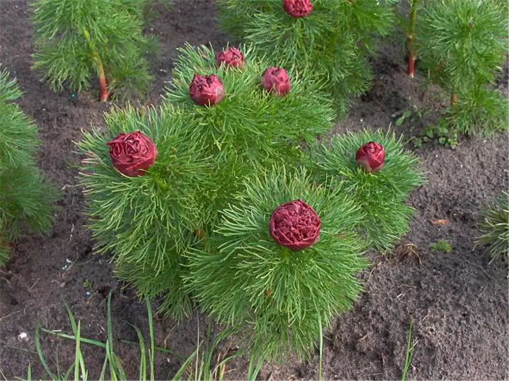 Paeonia tenuifolia 'Plena' bildet gefüllte, schalenförmige, dunkelrote Blüten ab Mai.