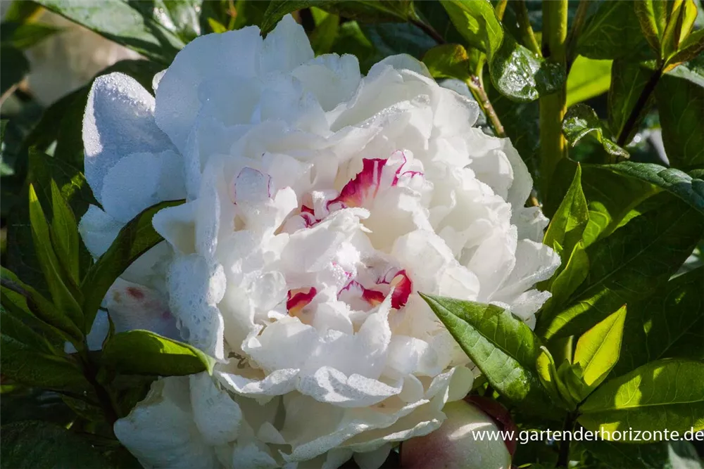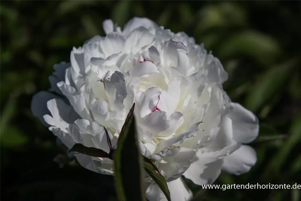 Paeonia lactiflora 'Festiva Maxima' bildet gefüllte, schalenförmige, weiße Blüten ab Mai. Diese verströmen einen angenehmen Duft.
