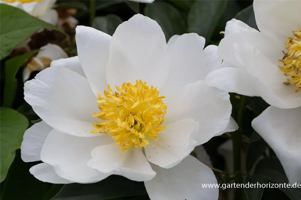 Paeonia lactiflora 'Jan van Leeuwen' bildet halbgefüllte, schalenförmige, weiß-gelbe Blüten ab Mai. Diese verströmen einen angenehmen Duft.