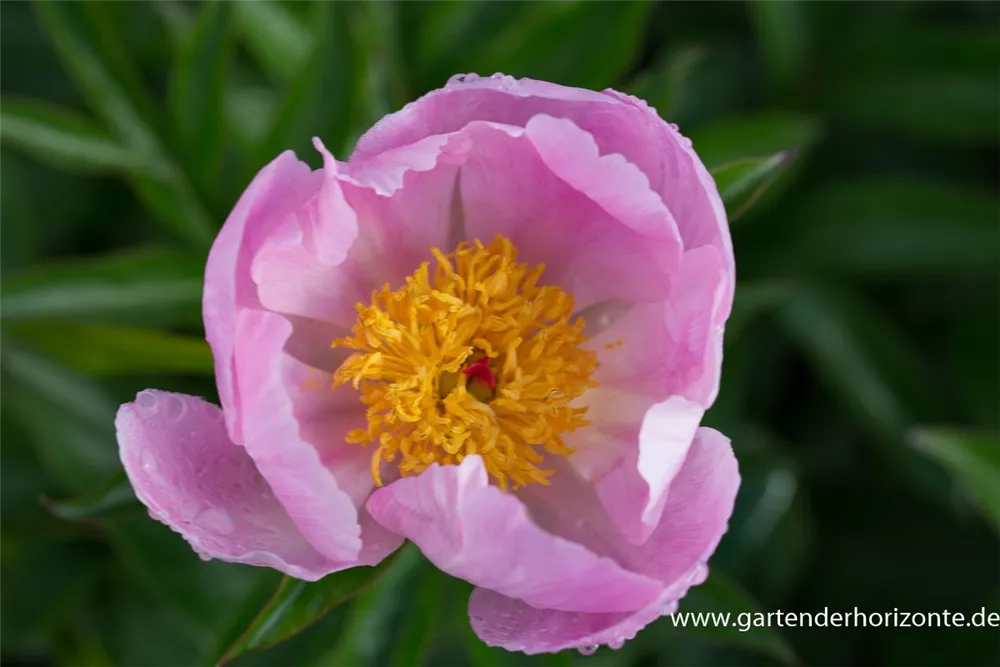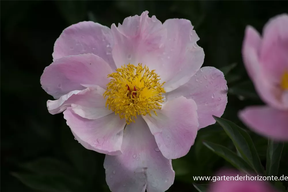 Paeonia lactiflora 'Nymphe' bildet schalenförmige, rosafarbene Blüten ab Mai.