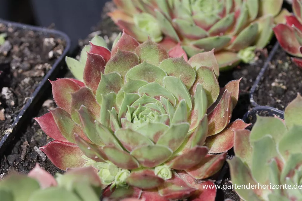 Die Garten-Steinrose 'Ornatum' (Sempervivum marmoreum) ist eine polsterbildende, rosettenartige wintergrüne Staude, die von Juni bis Juli rosafarbene, in Dolden angeordnete Blüten bildet. An einem sonnigen Standort mit durchlässigem, lockerem Boden erreicht sie gewöhnlich eine Höhe von ca. 20 cm und wird ca. 20 cm breit. Die Garten-Steinrose 'Ornatum' ist an geschützten Standorten gut frostverträglich.
