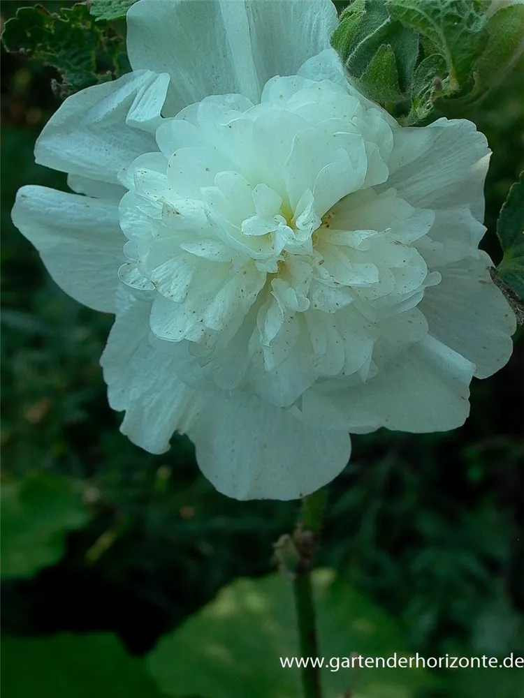 Alcea rosea 'Pleniflora', weiß bildet gefüllte, schalenförmige, in Trauben angeordnete, weiße Blüten ab Juli. Diese werden etwa 8 - 10 cm groß.