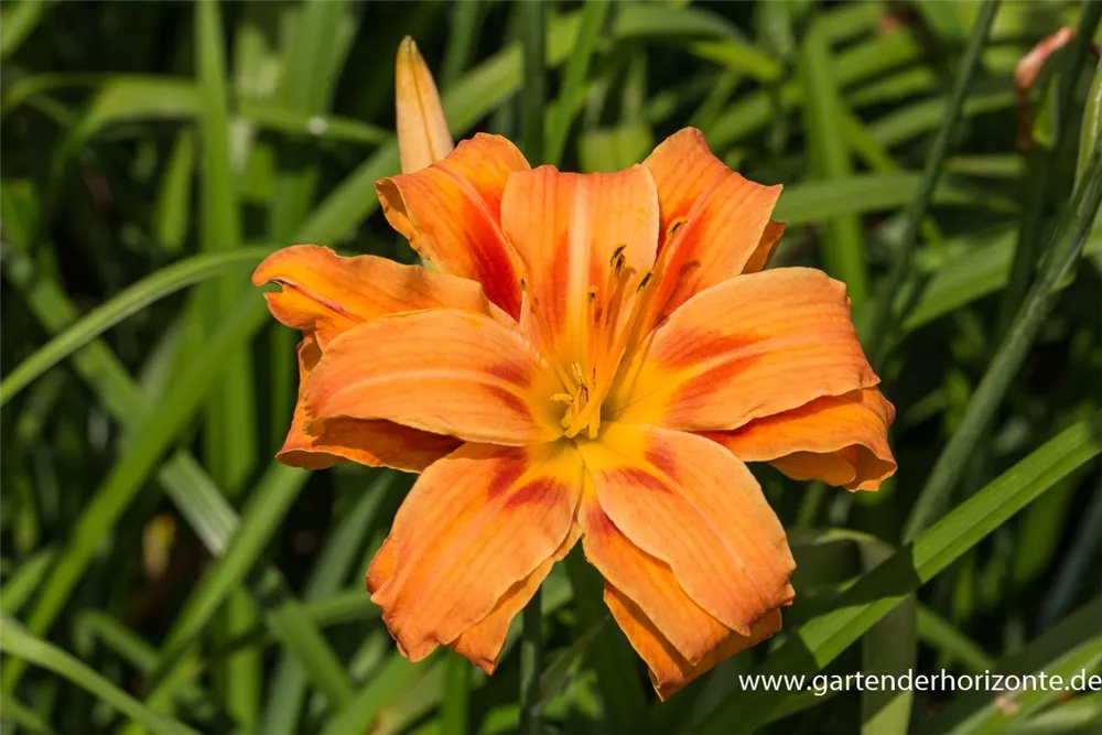 Hemerocallis fulva 'Kwanso' bildet gefüllte, trichterförmige, kupferorange Blüten ab Juli.