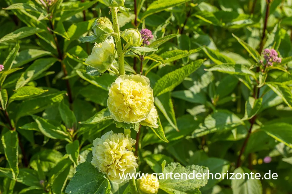 Die Gefülltblühende Garten-Stockrose (Alcea rosea) ist eine aufrechte, horstbildende Staude, die von Juli bis September gelbe, schalenförmige, in Trauben angeordnete Blüten bildet. An einem sonnigen Standort mit durchlässigem Boden erreicht sie gewöhnlich eine Höhe von ca. 2 m und wird ca. 60 cm breit. Die Gefülltblühende Garten-Stockrose ist gut frostverträglich.