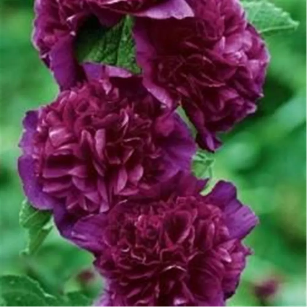 Alcea rosea 'Chater´s Violett' bildet gefüllte, schalenförmige, in Trauben angeordnete, lilafarbene Blüten ab Juli.