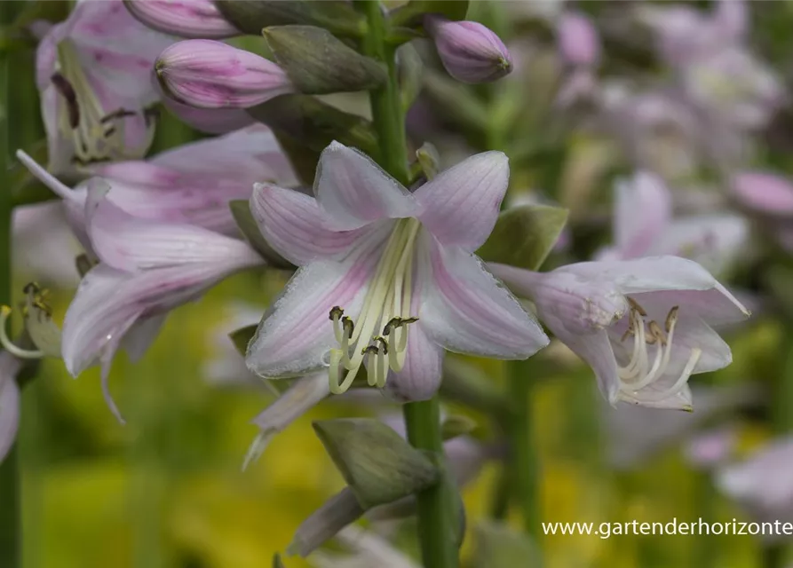 Hosta sieboldiana 'August Moon' bildet violette Blüten ab Juni.