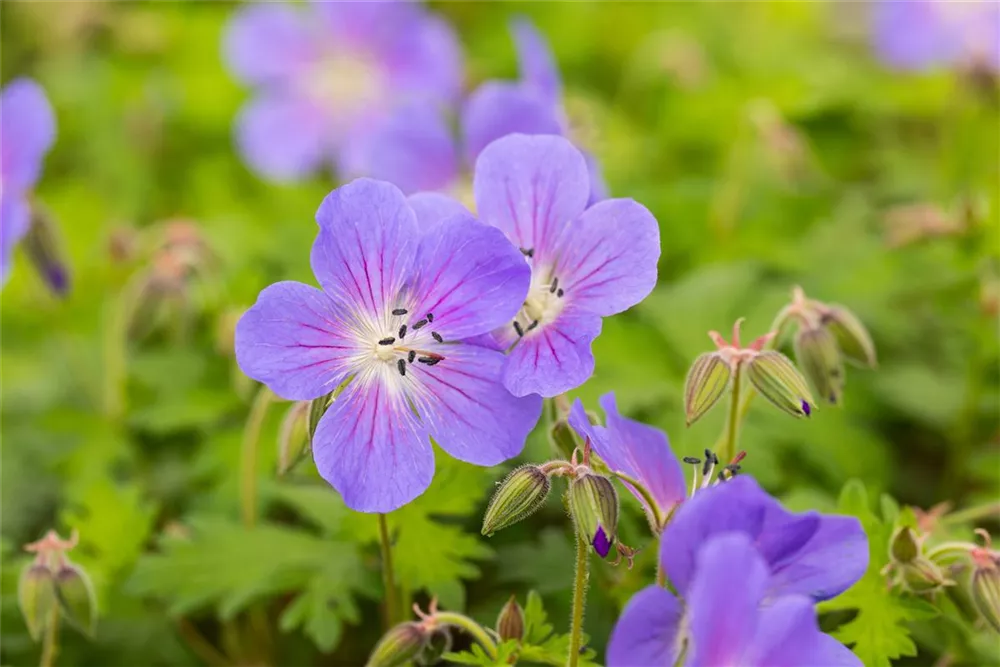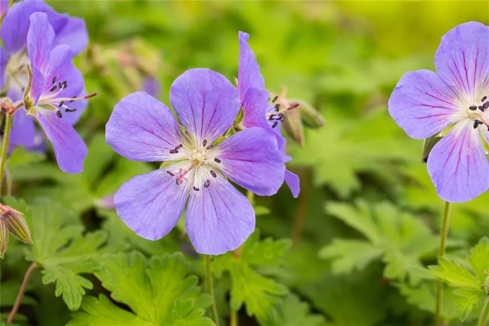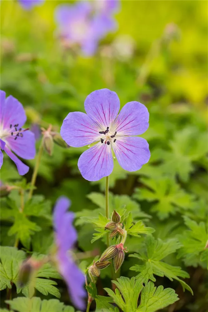 Geranium himalayense bildet blaue Blüten ab Mai.