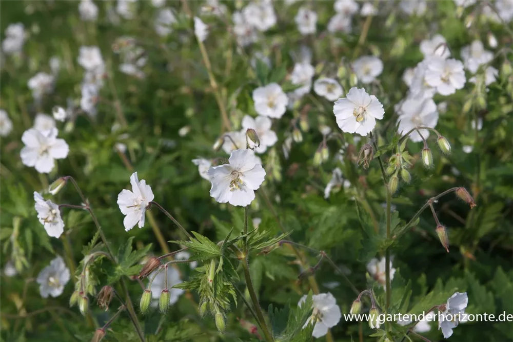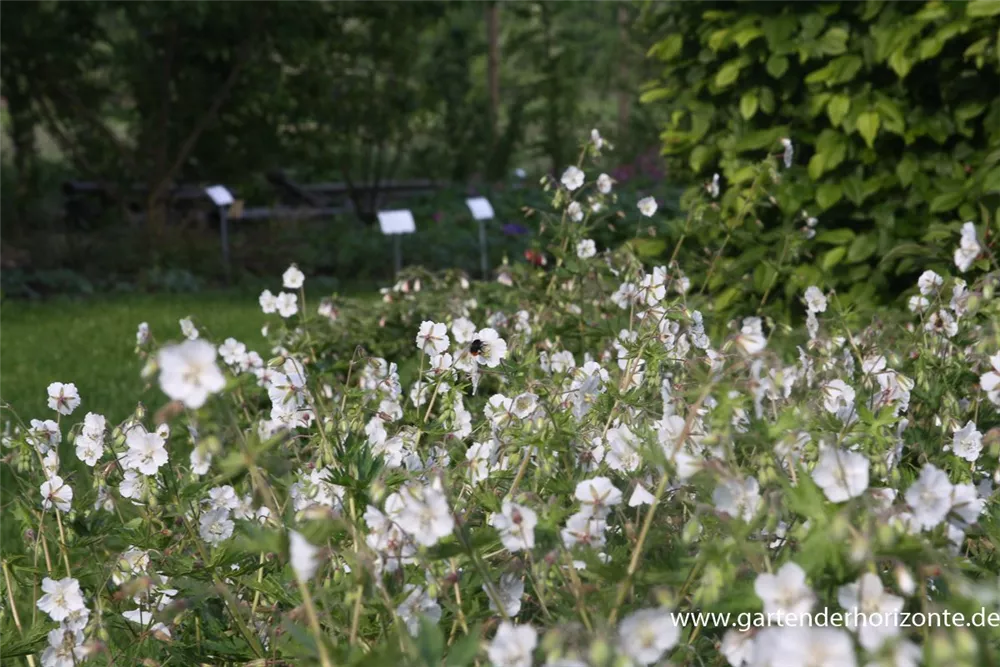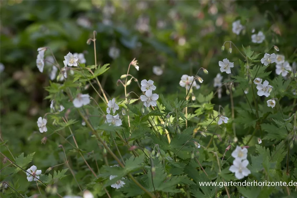 Geranium phaeum 'Album' bildet weiße Blüten ab Mai.