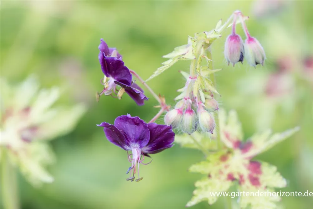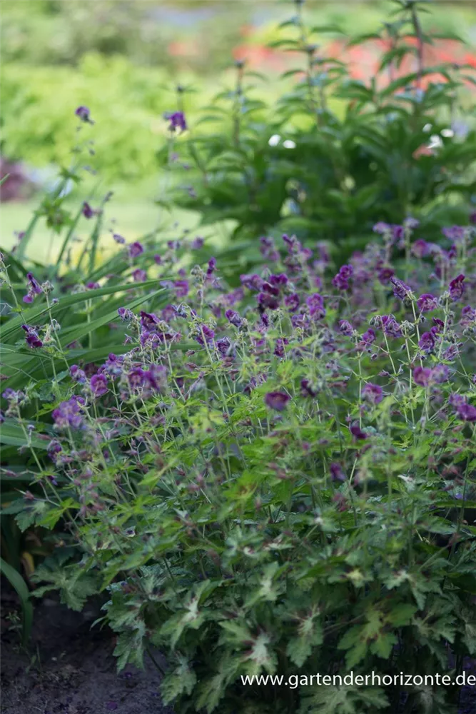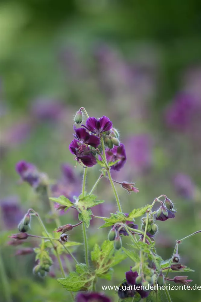 Geranium phaeum 'Springtime' bildet purpurrote Blüten ab Juni.