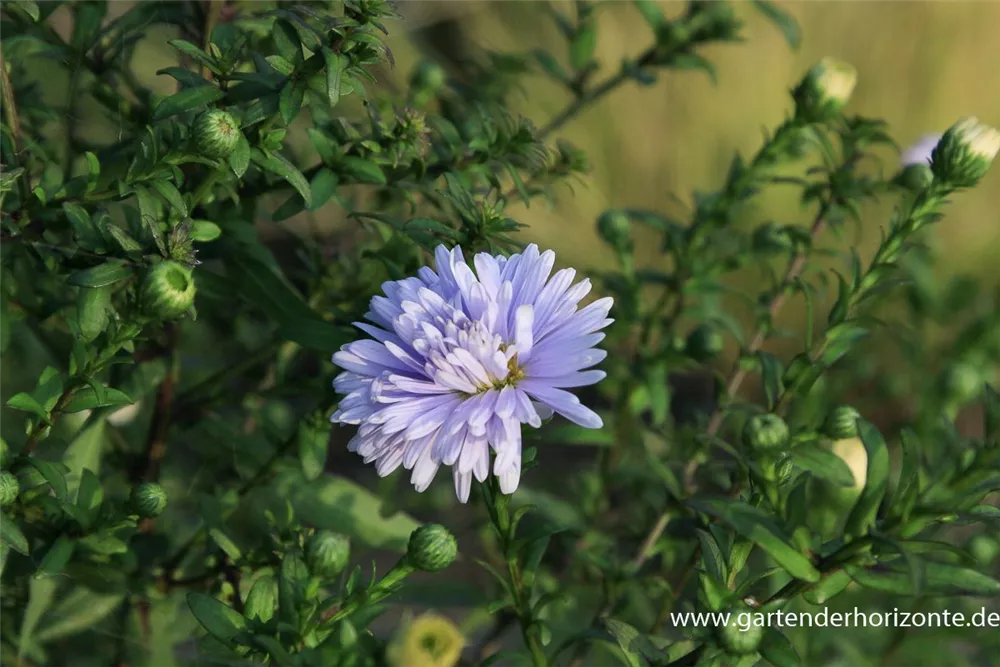 Aster novi-belgii 'Porzellan' bildet körbchenartige, hellblaue Blüten ab September. Diese verströmen einen angenehmen Duft.