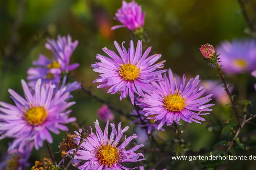 Aster laevis 'Glow in the Dark' bildet körbchenartige, magentafarbene Blüten ab September. Diese verströmen einen angenehmen Duft.