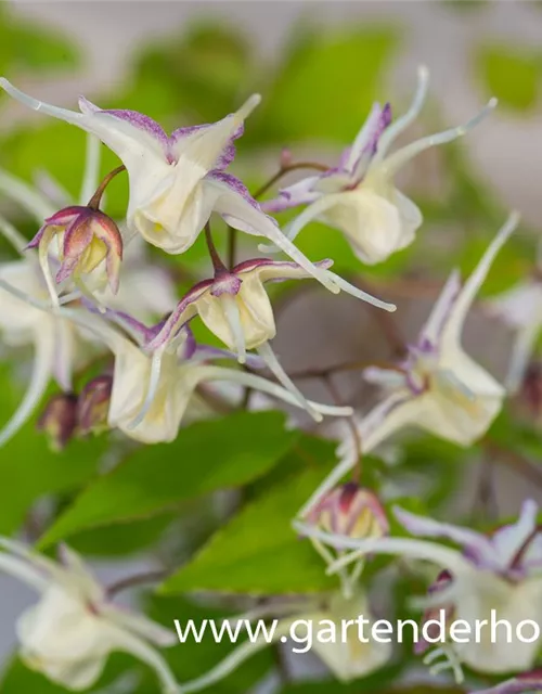 Epimedium grandiflorum, weiß bildet sternförmige, weiße Blüten ab April.