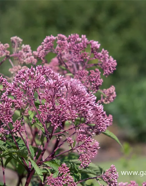 Der Große Garten-Wasserdost 'Riesenschirm' (Eupatorium fistulosum) ist eine aufrechte Staude, die von Juli bis September rote, in Doldentrauben, Dolden angeordnete Blüten mit einem angenehmen Duft bildet. An einem sonnigen bis halbschattigen Standort mit durchlässigem, nährstoffreichem Boden erreicht er gewöhnlich eine Höhe von ca. 2 m und wird ca. 1 m breit. Der Große Garten-Wasserdost 'Riesenschirm' ist gut frostverträglich.