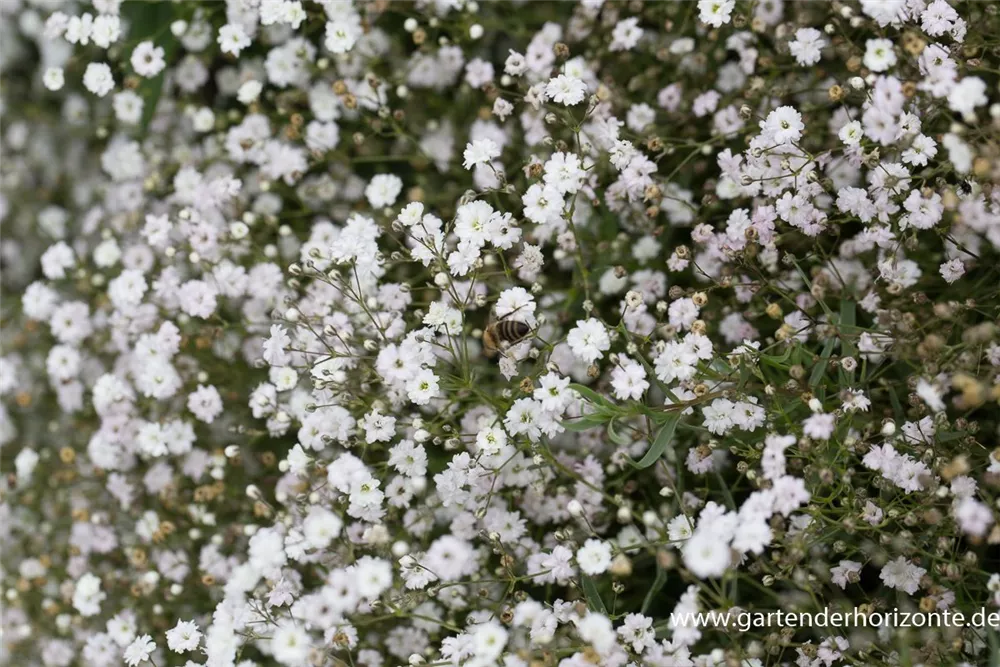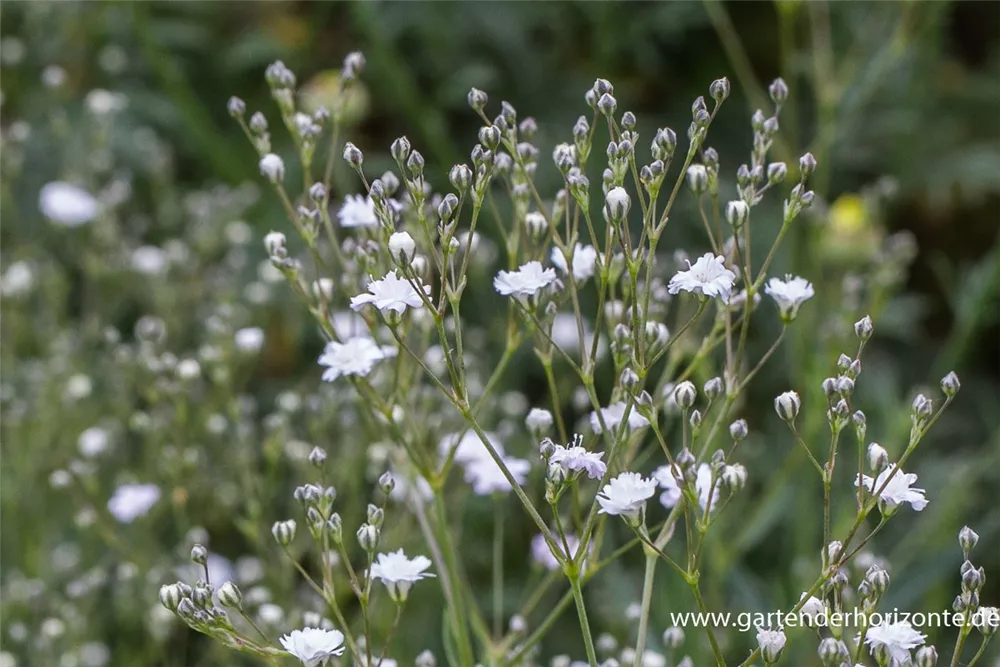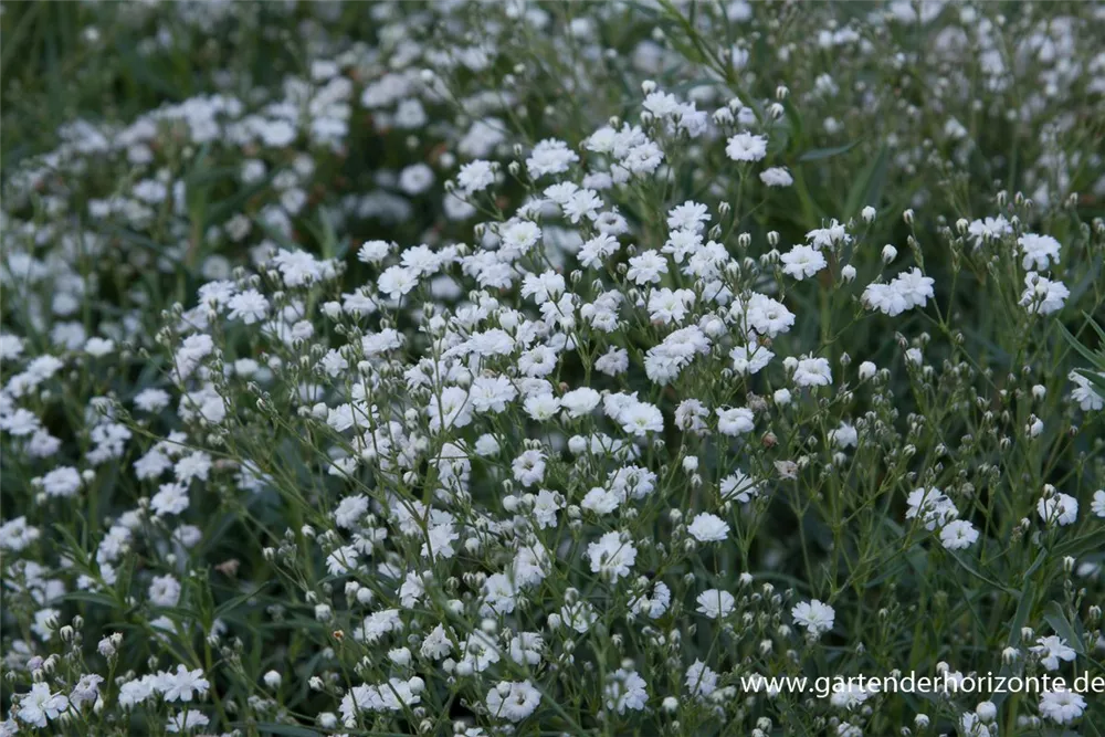 Gypsophila repens 'Compacta Plena' bildet in Rispen angeordnete, weiße Blüten ab Mai.