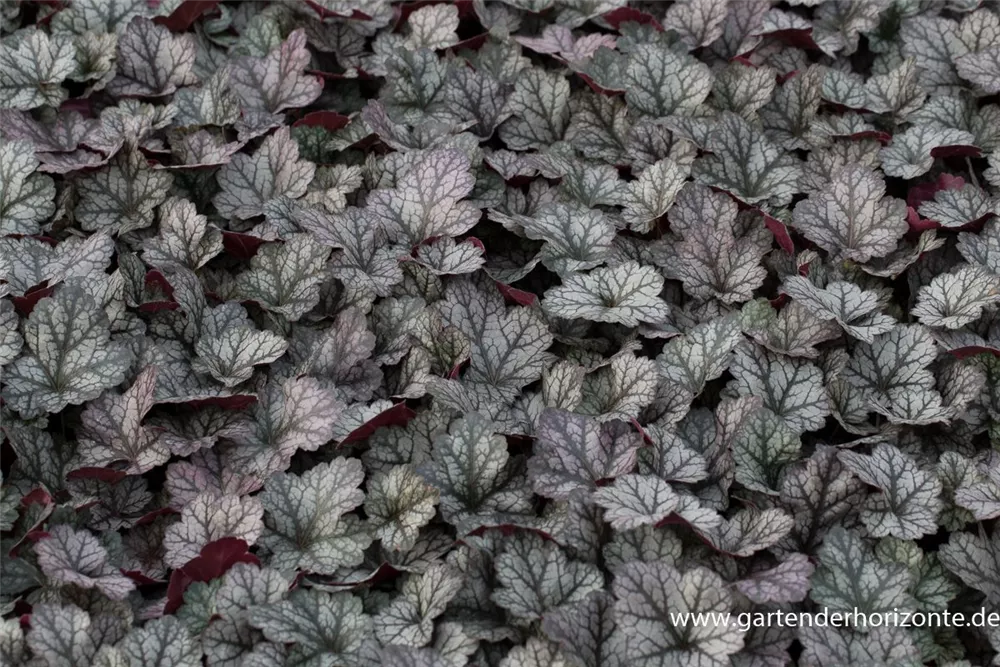 Hoher Blattschmuckwert. Die wintergrünen Blätter des Purpurglöckchens sind rosarot, dunkelrot geädert, rundlich, gekerbt.