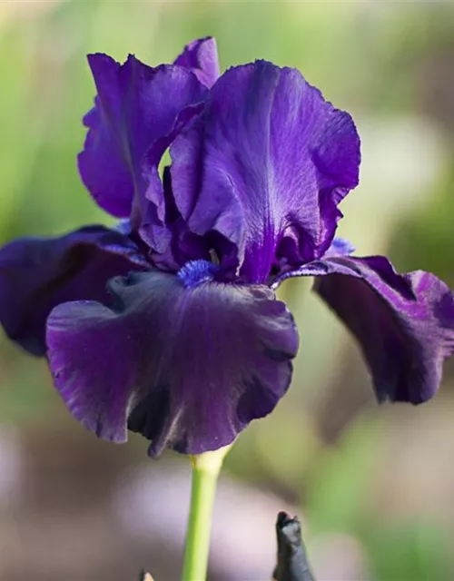 Iris x germanica 'Night Owl' bildet lippenförmige, dunkelblaue Blüten ab Mai.