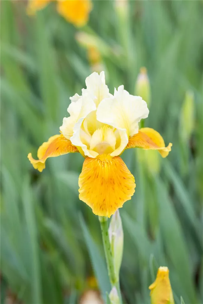 Iris x germanica 'Tulip Festival' bildet lippenförmige, blaue, violette, lilafarbene, weiße, gelbe, gelb-weiße Blüten ab Mai.