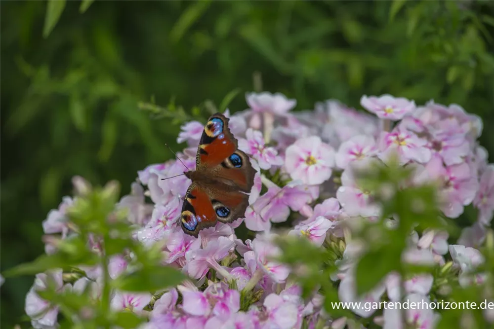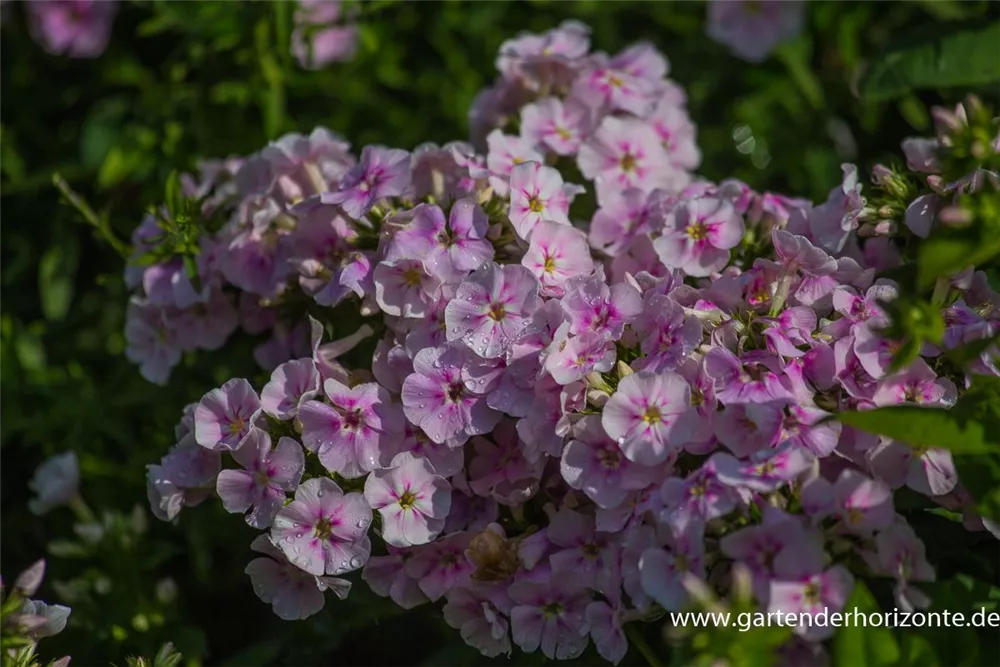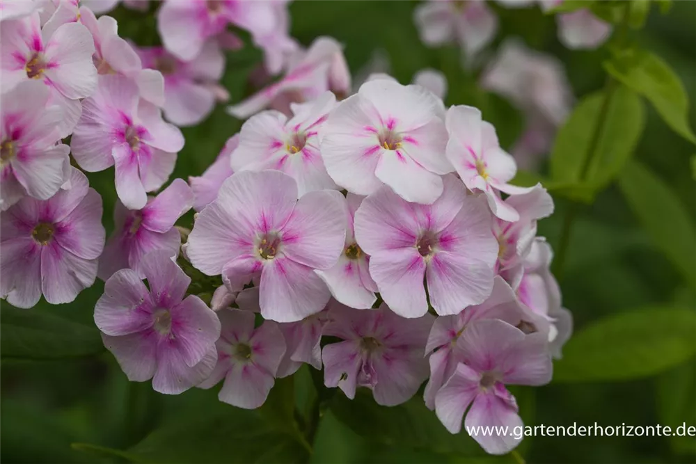 Phlox paniculata 'Younique Bicolor' bildet in Dolden angeordnete, weiß-rosafarbene Blüten ab Juli. Diese verströmen einen leichten Duft.