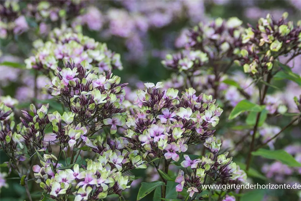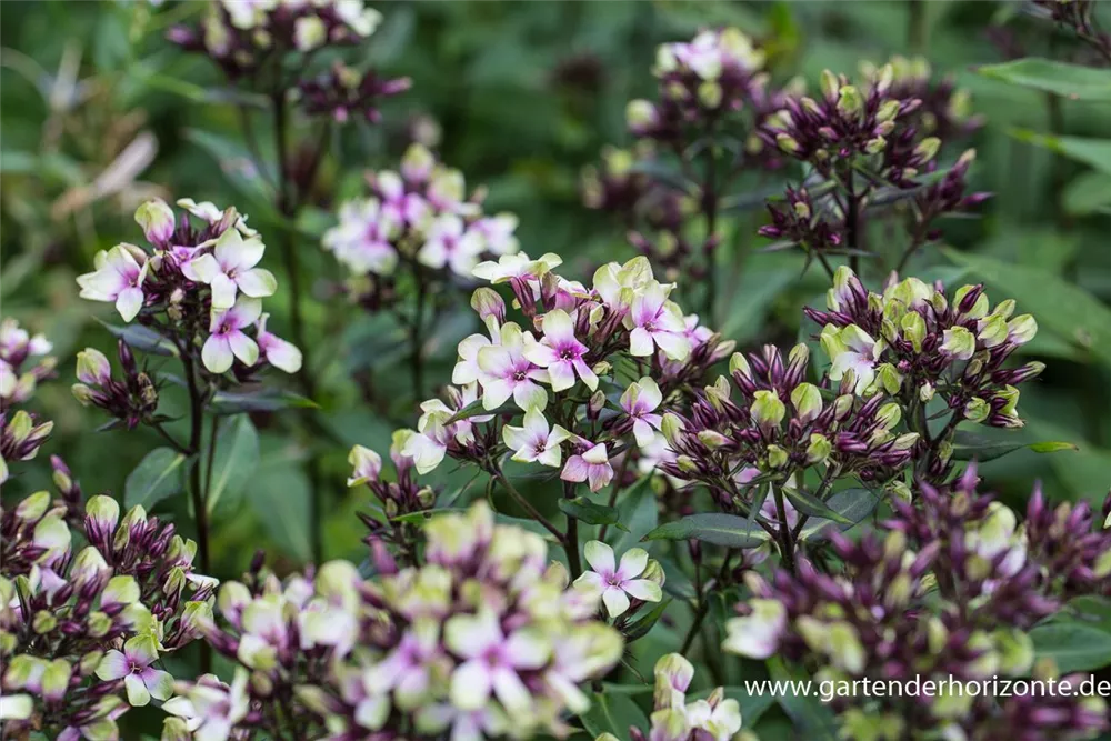 Phlox paniculata, blau-weiß bildet in Dolden angeordnete, blau-weiße Blüten ab Juli. Diese verströmen einen schwachen Duft.