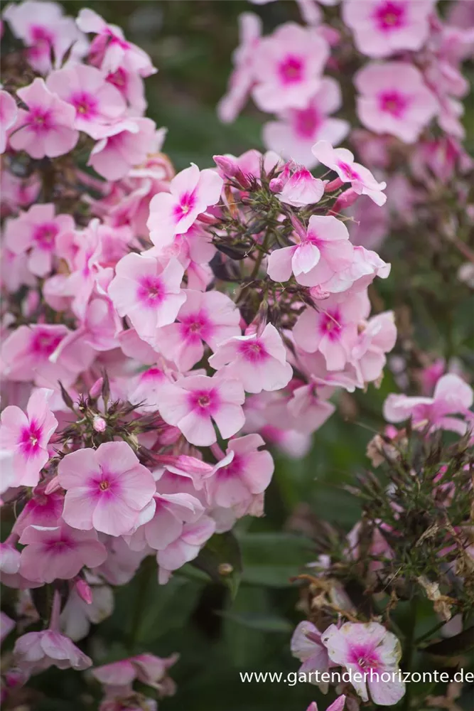 Die Hohe Garten-Flammenblume (Phlox paniculata) ist eine aufrechte Staude, die von Juli bis August zweifarbige, in Dolden angeordnete Blüten mit einem leichten Duft bildet. An einem sonnigen bis halbschattigen Standort mit durchlässigem, nährstoffreichem Boden erreicht sie gewöhnlich eine Höhe von ca. 90 cm und wird ca. 60 cm breit. Die Hohe Garten-Flammenblume ist gut frostverträglich.