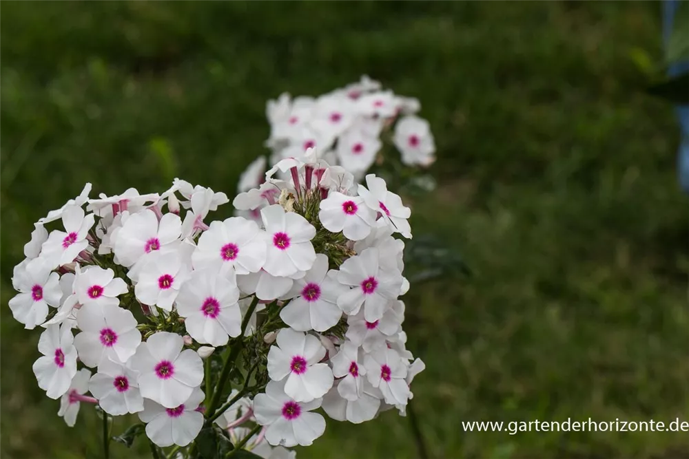 Phlox paniculata 'Kirmesländler' bildet in Dolden angeordnete, weiß-rote Blüten ab Juli. Diese verströmen einen leichten Duft.