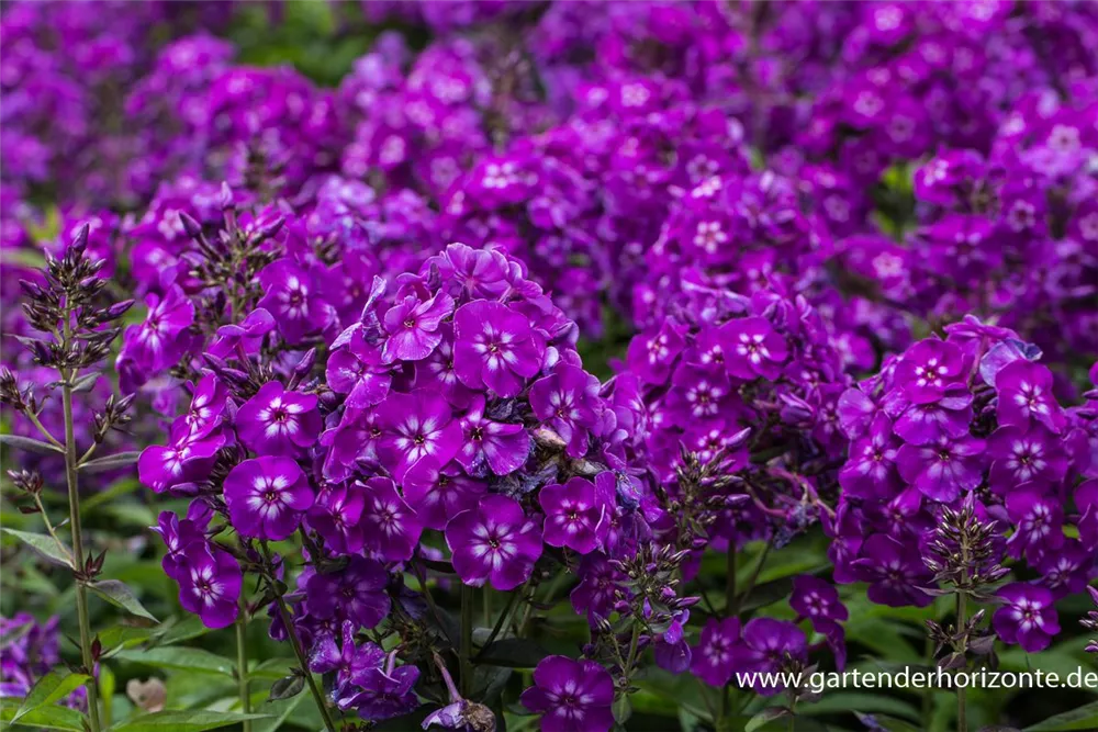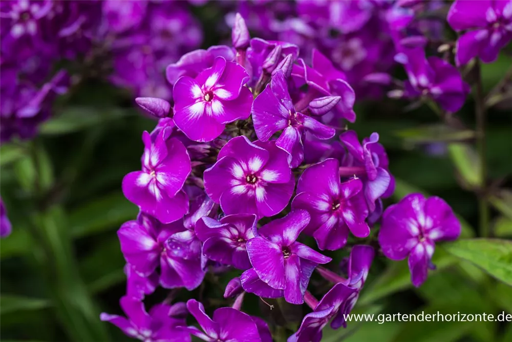 Phlox paniculata 'Purple Kiss' bildet in Dolden angeordnete, violette Blüten ab Ende Juni.