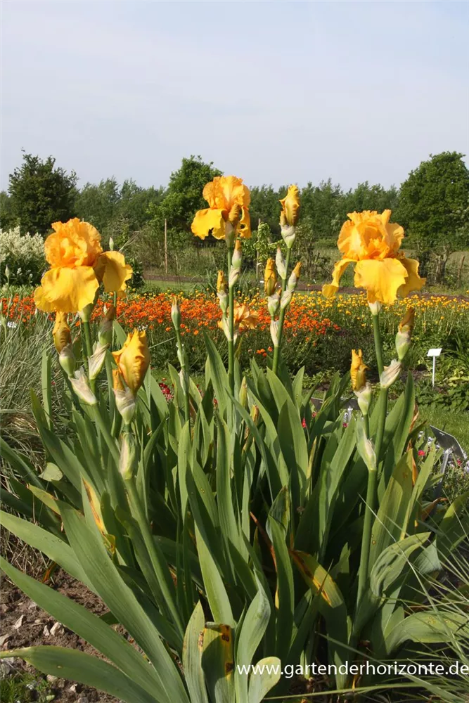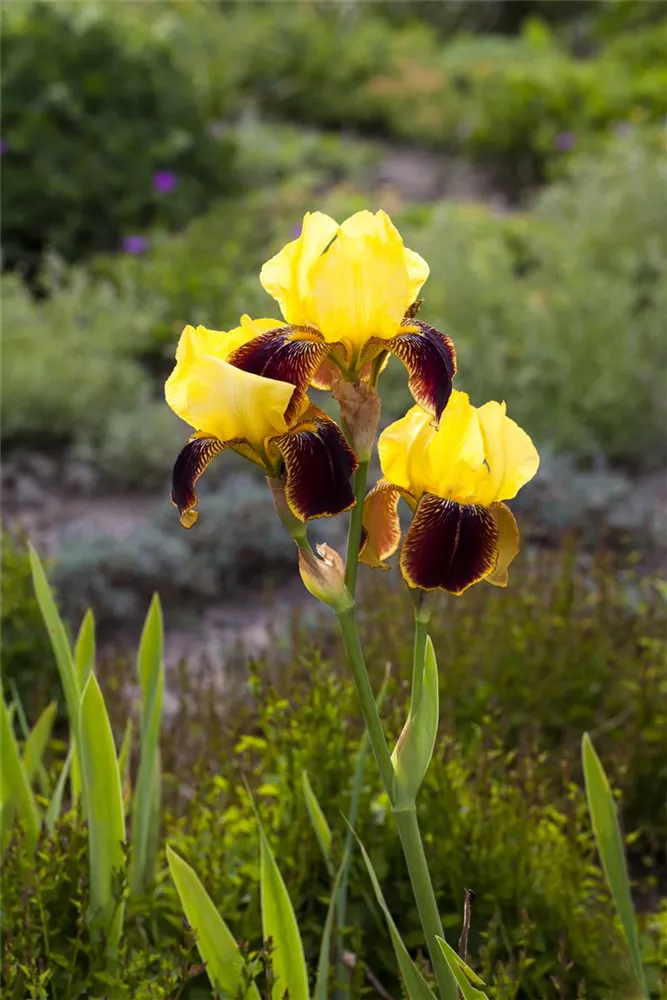 Die Hohe Garten-Schwertlilie (Iris x germanica) ist eine aufrechte, rhizombildende Staude, die von Mai bis Juni goldgelbe, lippenförmige Blüten bildet. An einem sonnigen Standort mit durchlässigem, kalkhaltigem, nährstoffreichem Boden erreicht sie gewöhnlich eine Höhe von ca. 80 cm und wird ca. 40 cm breit. Die Hohe Garten-Schwertlilie ist gut frostverträglich.
