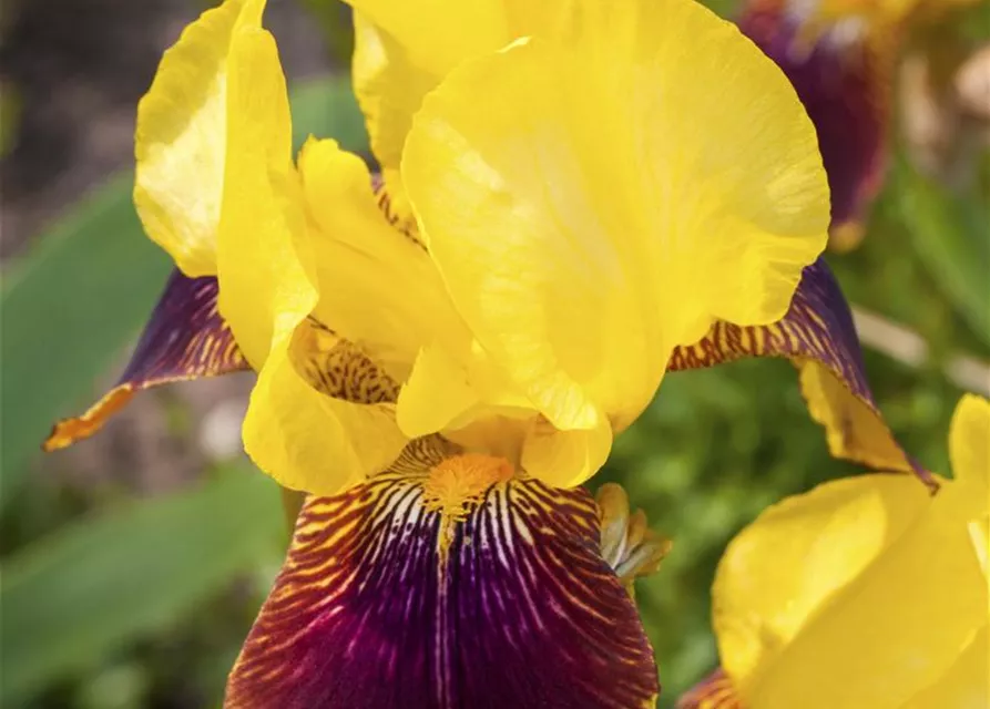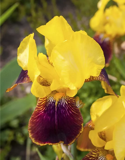 Iris x germanica 'Ola Kala' bildet lippenförmige, goldgelbe Blüten ab Mai.