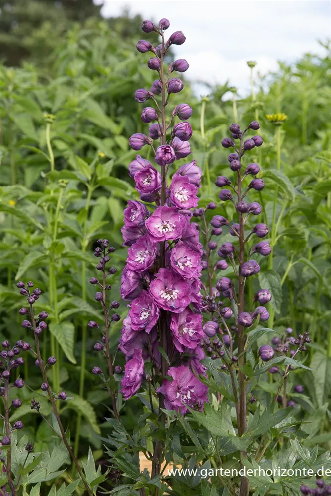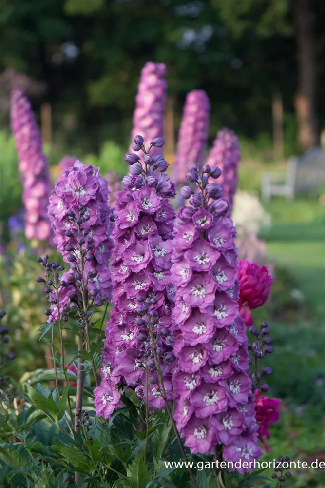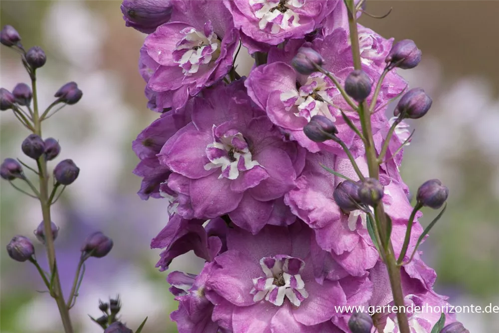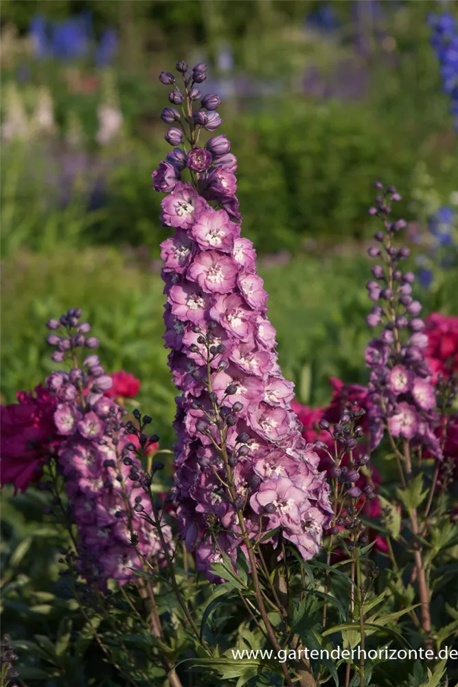 Delphinium x elatum 'Pink Power' bildet halbgefüllte, schalenförmige, in Rispen angeordnete, violette Blüten ab Juni. Bei richtiger Pflege Nachblüte von September bis Oktober.