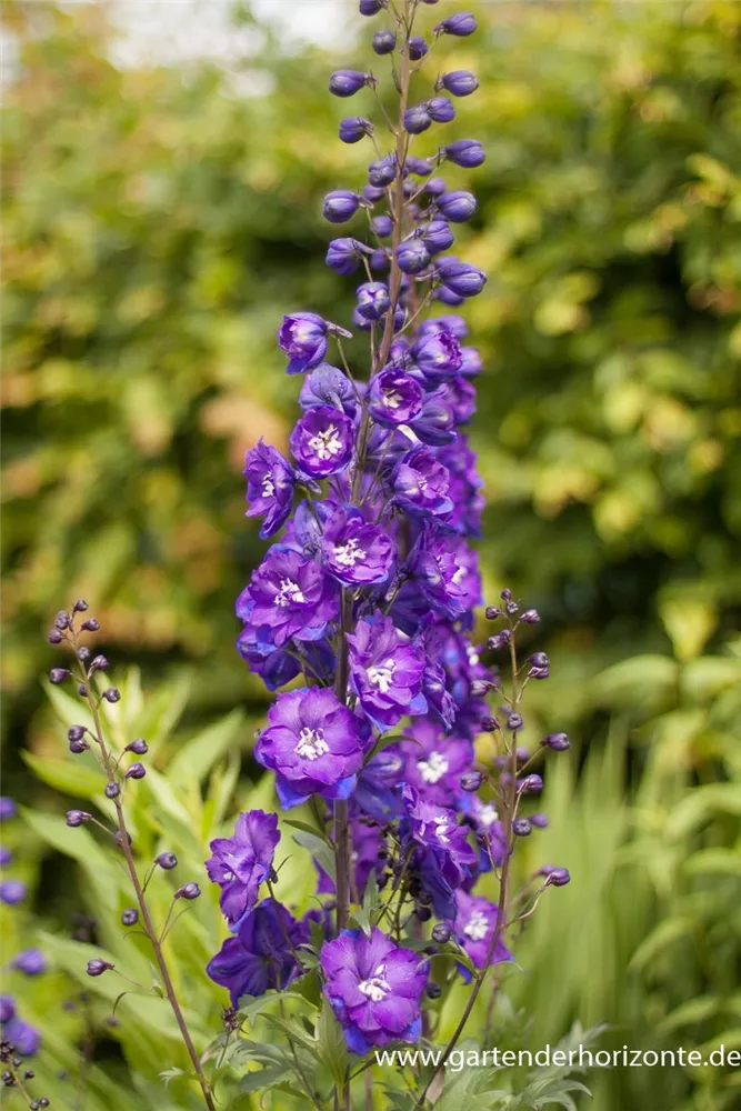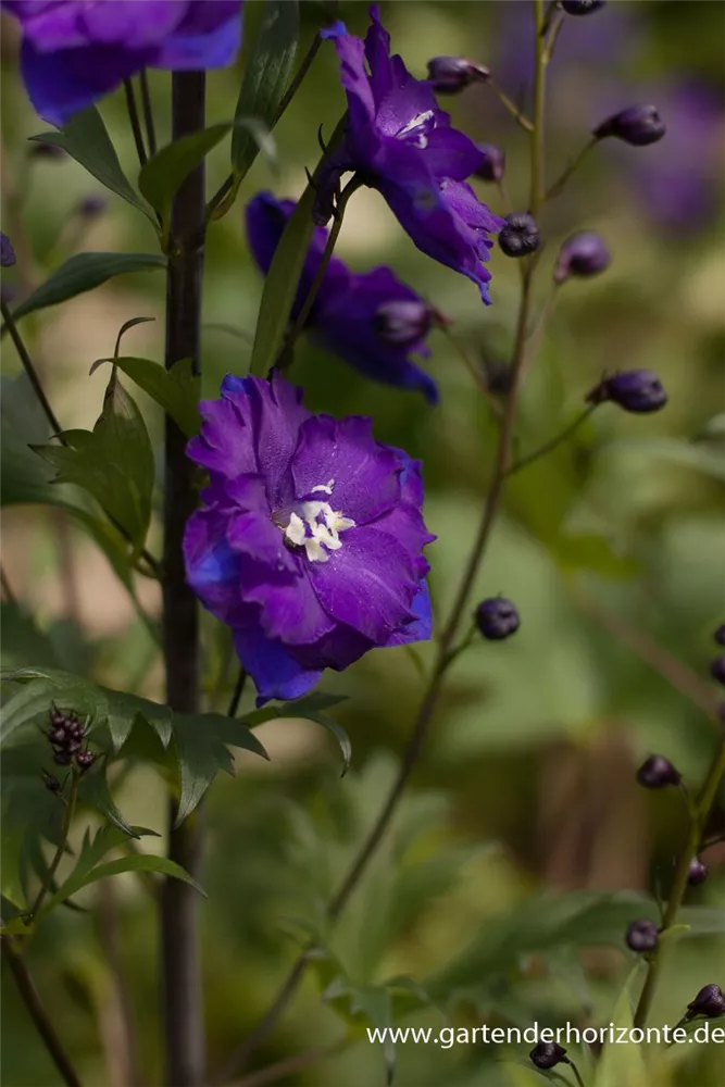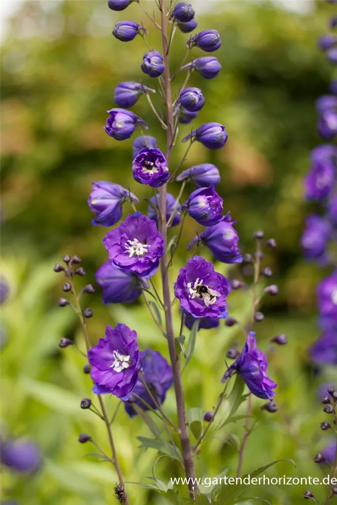Delphinium x elatum 'Christel' bildet schalenförmige, in Rispen angeordnete, dunkelviolette Blüten ab Juni. Bei richtiger Pflege Nachblüte von September bis Oktober.