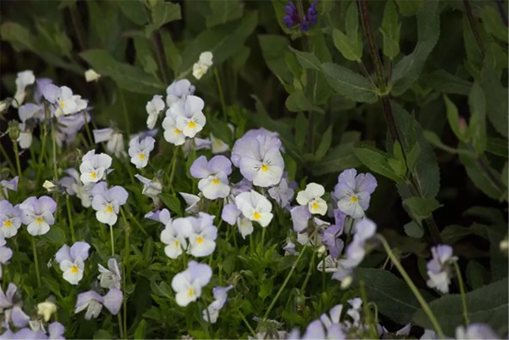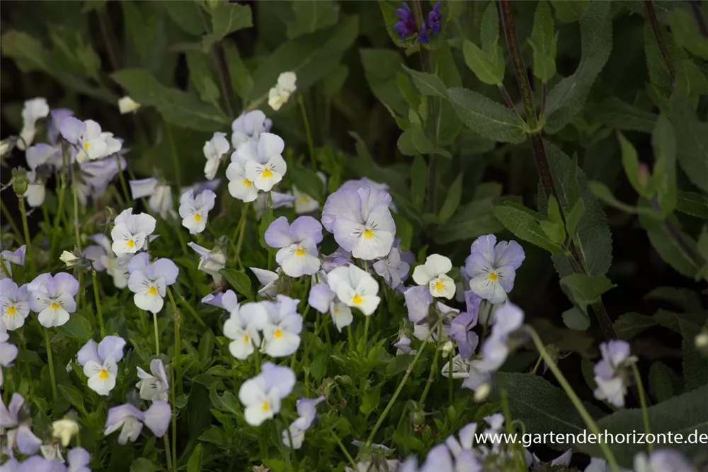 Horn-Veilchen 'Milkmaid' ist auch unter diesem Namen bekannt: Gehörntes Stiefmütterchen.