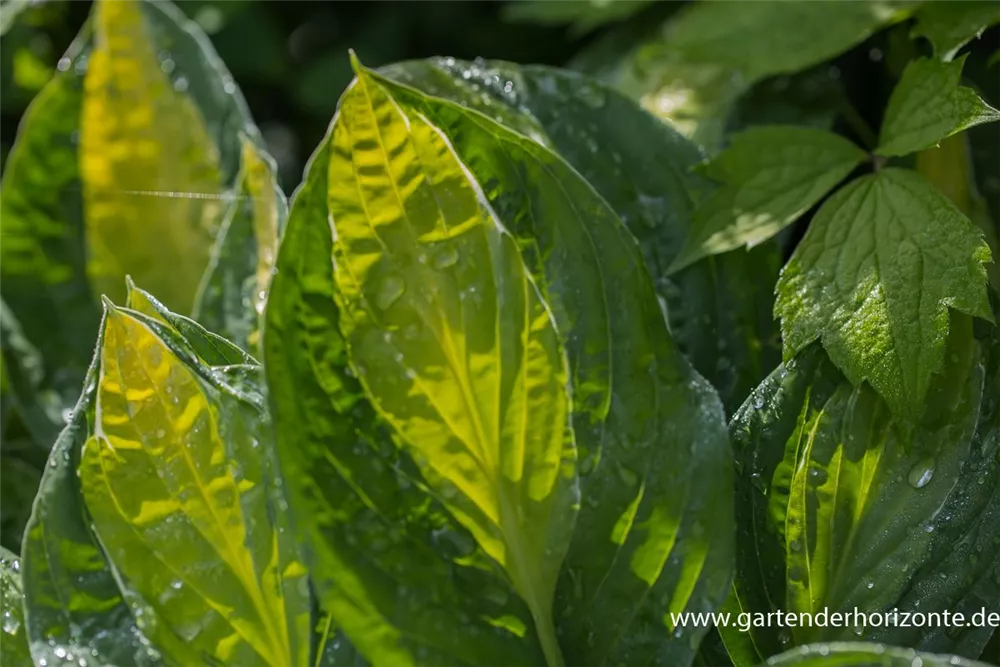 Hoher Blattschmuckwert. Die sommergrünen Blätter der Funkie sind gelb-grün, grundständig, ganzrandig.