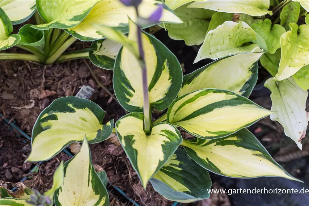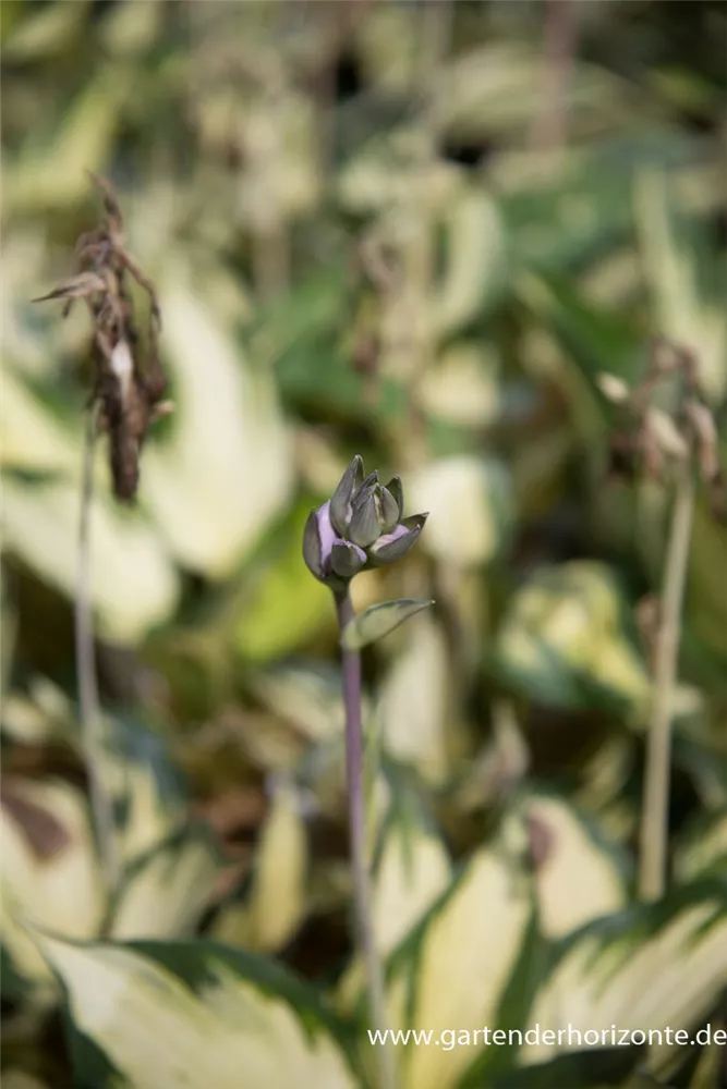 Hosta x fortunei 'Morning Light' bildet lilafarbene Blüten ab Juni.