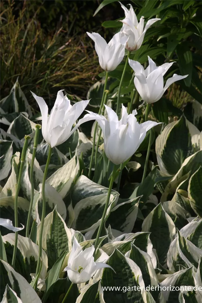 Hosta x fortunei 'Patriot' bildet lilafarbene Blüten ab Juli.
