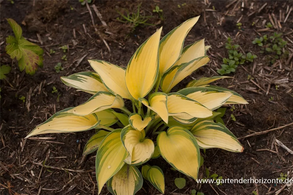 Die Graublaue Garten-Funkie 'June'® (Hosta x tardiana) ist eine horstbildende, aufrechte, breite, buschige Staude mit dekorativen, herzförmigen, gelben Blättern. An einem halbschattigen Standort mit durchlässigem, humosem Boden erreicht sie gewöhnlich eine Höhe von ca. 45 cm und wird ca. 50 cm breit. Die Graublaue Garten-Funkie 'June'® ist gut frostverträglich.