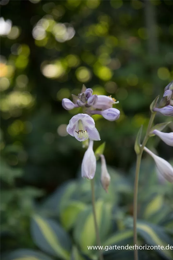 Hosta x tardiana 'June'® bildet lilafarbene Blüten ab Juli.