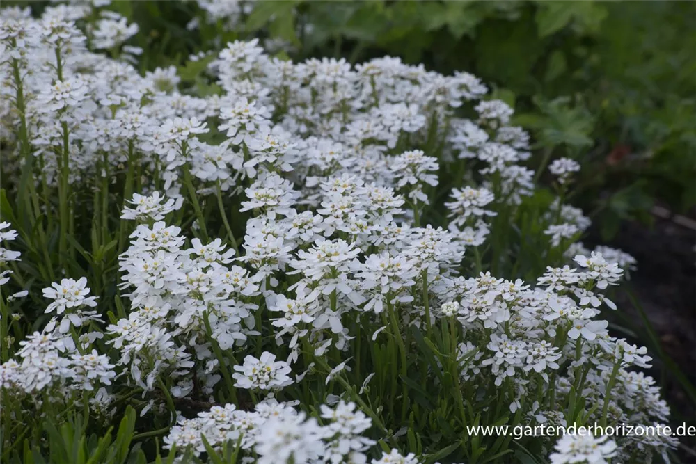 Iberis sempervirens 'Findel' bildet in Dolden angeordnete, weiße Blüten ab April. Diese werden etwa 3 - 4 cm groß.