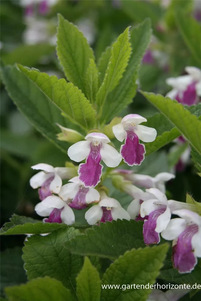 Melittis melissophyllum 'Royal Velvet Distinction'® bildet lippenförmige, in Quirle angeordnete, zweifarbige Blüten ab Mai. Diese verströmen einen angenehmen Duft.