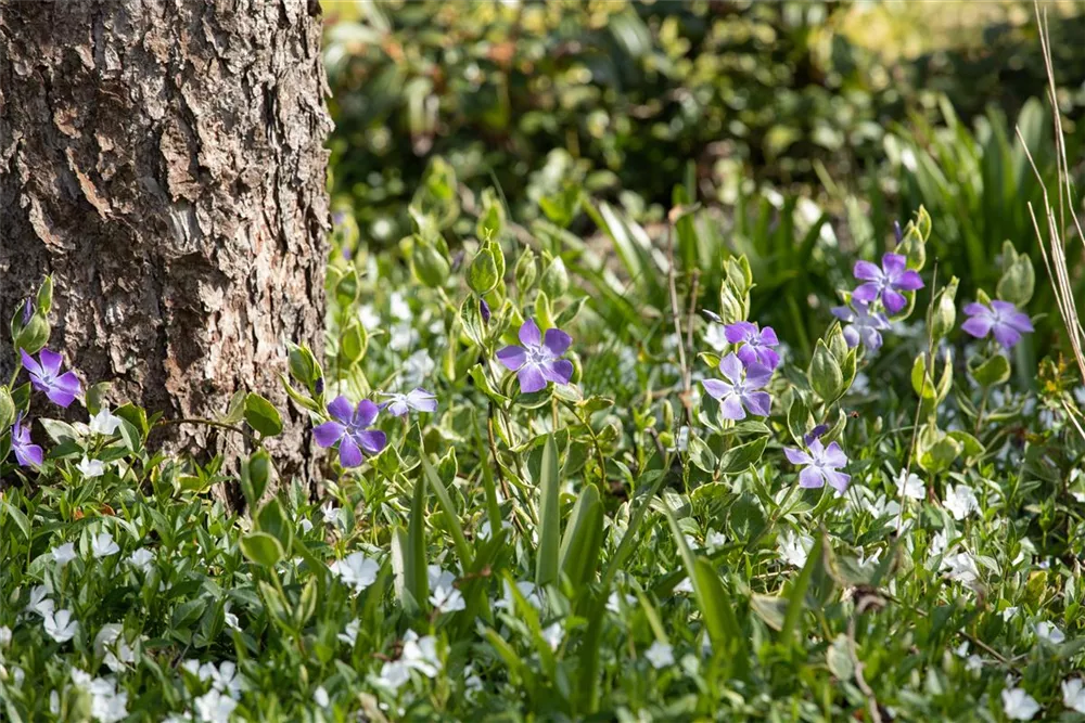 Das Kleine Garten-Immergrün 'Blanca' setzt schöne Akzente gemeinsam mit: