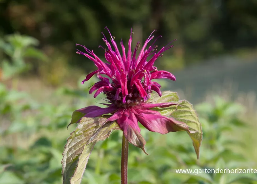 Monarda fistulosa 'Kardinal' bildet lippenförmige, in Quirlen angeordnete, karminrote Blüten ab Juli.