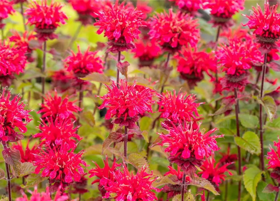 Monarda fistulosa 'On Parade' bildet lippenförmige, in Quirle angeordnete, rote Blüten ab Juli.