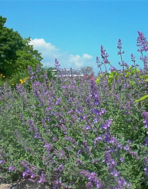 Die Katzenminze (Nepeta x faassenii) ist eine horstbildende, buschige Staude, die von Mai bis September blaue, lippenförmige Blüten bildet. An einem sonnigen Standort mit durchlässigem, sandigem Boden erreicht sie gewöhnlich eine Höhe von ca. 30 cm und wird ca. 30 cm breit. Die Katzenminze ist gut frostverträglich.