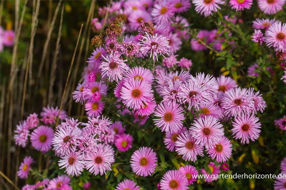 Die Garten-Kissen-Aster 'Herbstgruß vom Bresserhof' setzt schöne Akzente gemeinsam mit:
