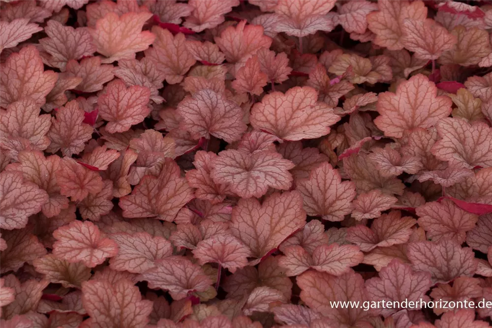 Hoher Blattschmuckwert. Die wintergrünen Blätter des Garten-Purpurglöckchens 'Georgia Peach' sind dunkelrot.