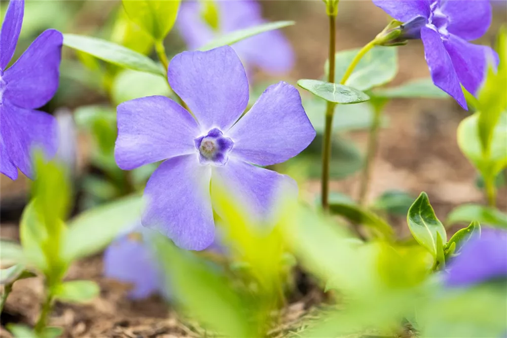 Kleines Garten-Immergrün 'Bowles' ist ein kriechend und teppichartig wachsender Halbstrauch, der eine Höhe von 10 - 15 cm erreichen kann.