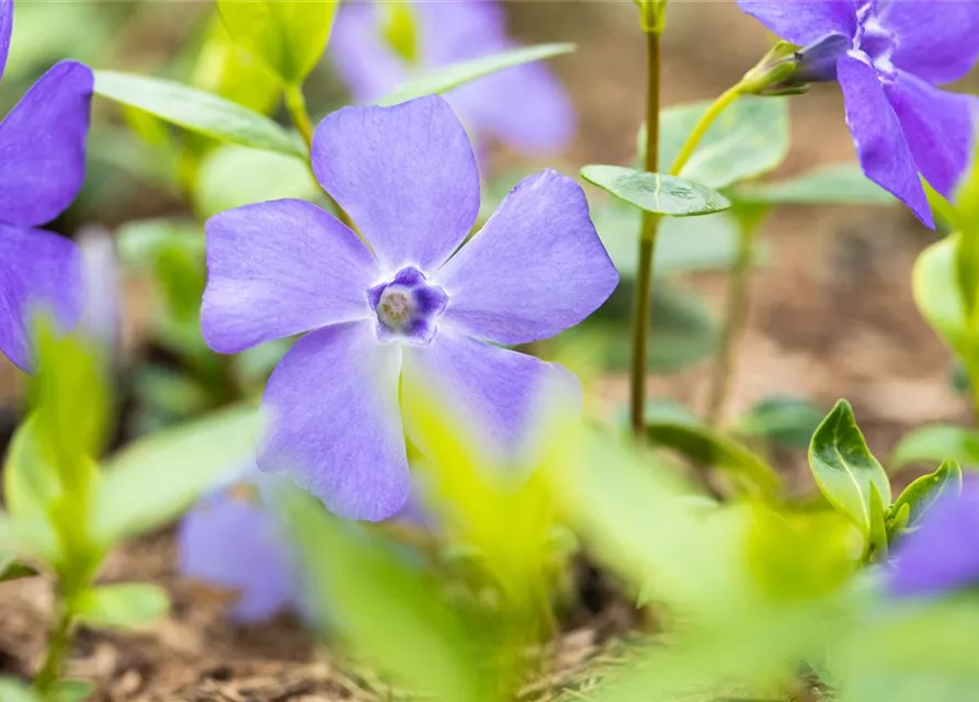 Vinca minor 'Bowles' bildet radförmige, blaue Blüten ab Mai. Bei richtiger Pflege Nachblüte im September.
