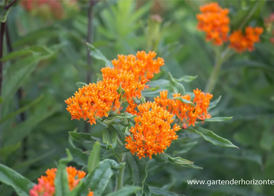 Asclepias tuberosa bildet sternförmige, in Dolden angeordnete, orangefarbene Blüten ab Juni. Diese verströmen einen angenehmen Duft.