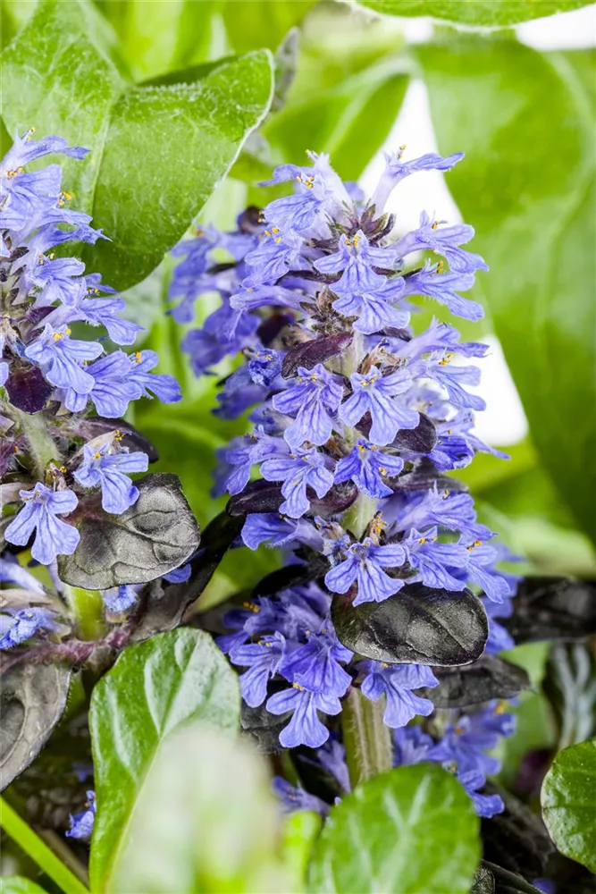Ajuga reptans bildet lippenförmige, in Quirlen angeordnete, blaue Blüten ab April.