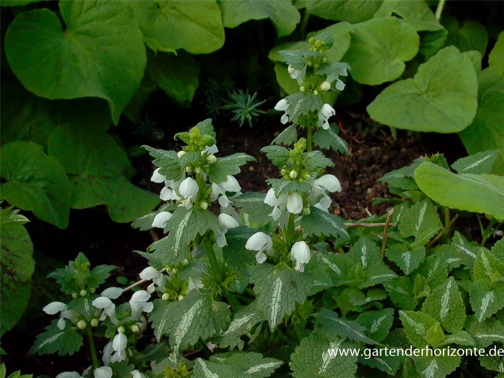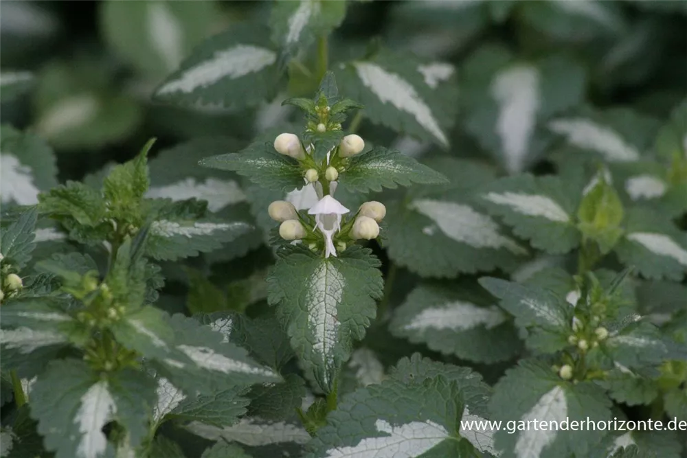 Die Gefleckte Garten-Taubnessel 'Album' (Lamium maculatum) ist eine kriechende wintergrüne Staude mit dekorativen, herzförmigen, grün-weißen Blättern. An einem halbschattigen bis schattigen Standort mit kalkhaltigem, lockerem, lehmigem Boden erreicht sie gewöhnlich eine Höhe von ca. 25 cm und wird ca. 30 cm breit. Die Gefleckte Garten-Taubnessel 'Album' ist gut frostverträglich.